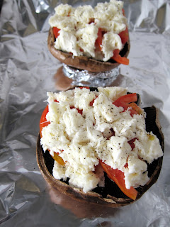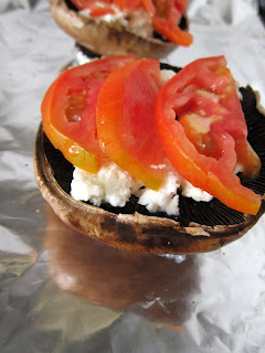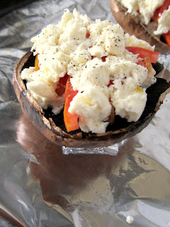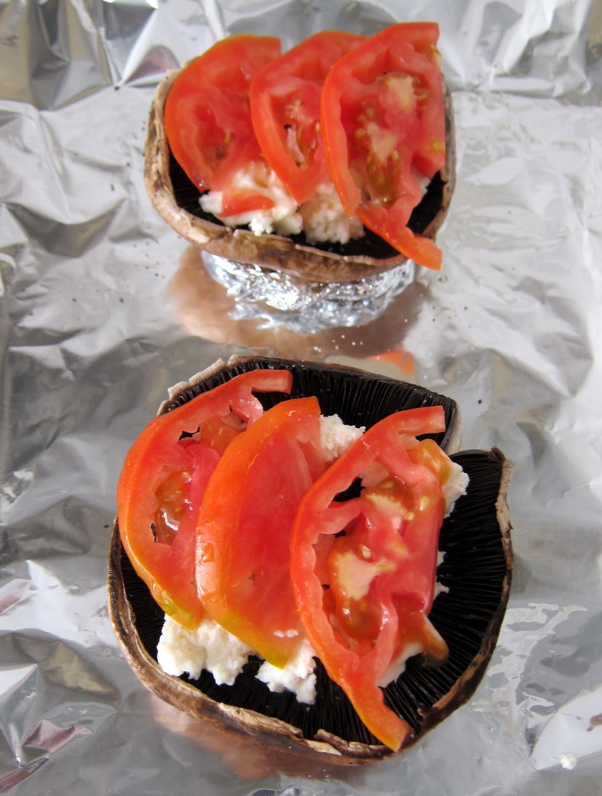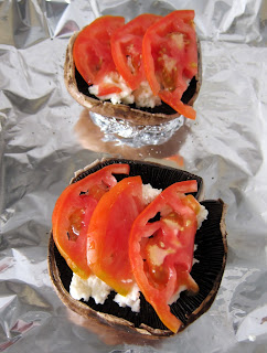Continuemos... Sobre os portobello, coloquei mozzarella aos bocados. Usei uma embalagem de mozzarella para dois cogumelos. Depois, coloquei em cima tomate às fatias (na receita original são usados tomates cherry).